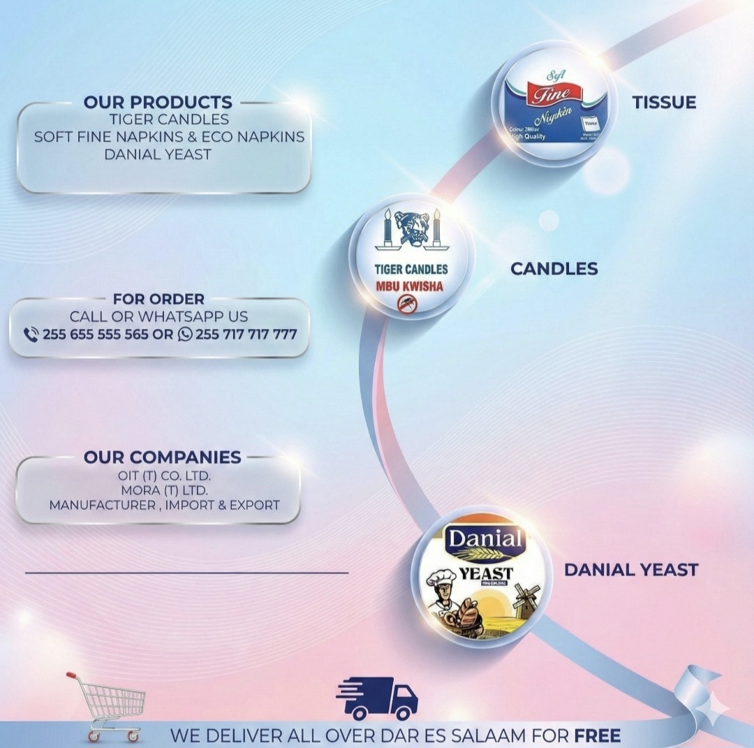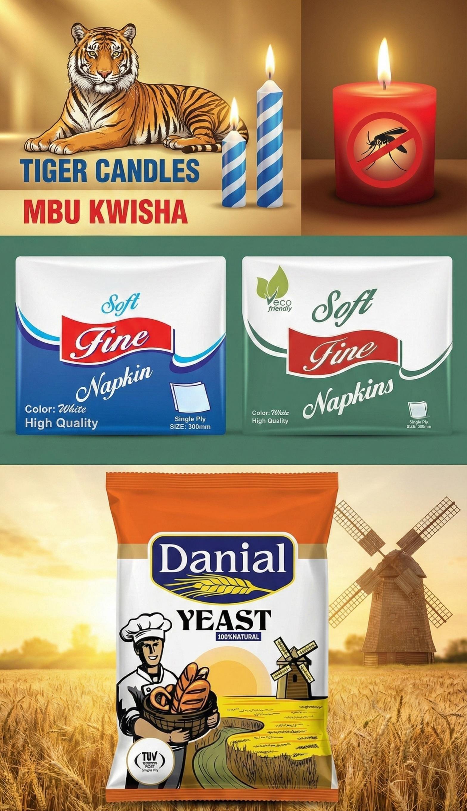 Selling High Quality Tiger Candles & Fine Napkins , Registered TRADEMARK in Tanzania & Manufacture since year 1999 of Tiger Candles ( long lasting) pure white color made with clean burning wax and then over dipped our candles are smokeless and clean burning with lead-free cotton wicks perfect for wedding parties ,restaurants use or any events , & Tiger Candles+ Anti Mosquito Repels mosquitoes and other flying insects You can enjoy your camping trip or relax in your backyard & inside home. The candle is made with real citronella oil and will help repel annoying mosquitoes. Soft Fine Napkins & ECO Napkins are soft in texture and thus suitable to be used as face napkins and wipes sourced high quality facial tissues are now improved to give you and your family soothing comfort and ease in your daily activities. Using an innovative new technology, the tissues are developed from top quality 100% pure virgin fiber for extra softness. The tissues are now softer without compromising the strength and quality that you have come to expect. Remove your make up or wipe your child's smudged face without leaving residue or crumbling when wet.